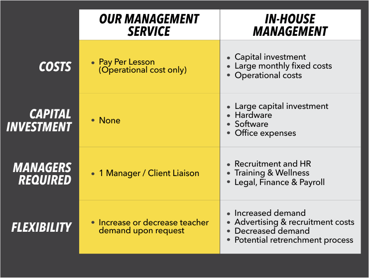 - Increased Cost Efficiencies - No capital or monthly spend for in-house teacher recruitment, management, or finance teams.